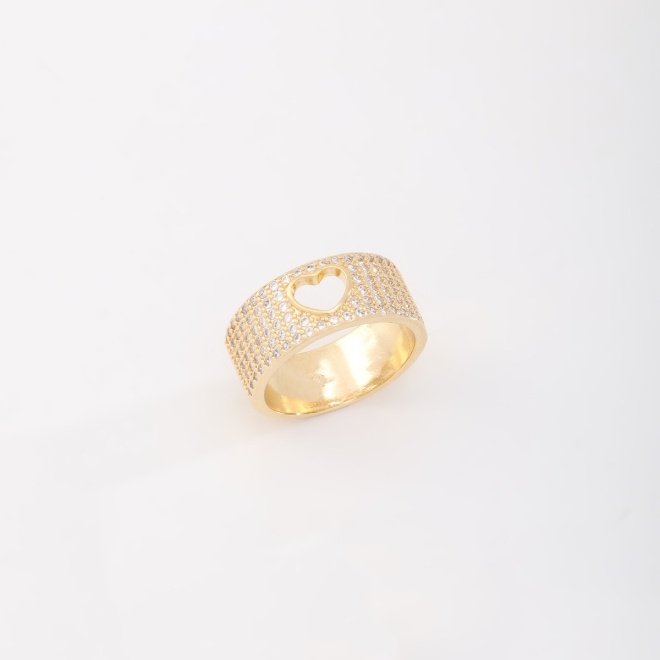 ANEL BANHADO A OURO 18K COM DETALHES EM ZIRCÔNIAS E VAZADO EM FORMATO DE CORAÇÃO, IDEAL PARA QUEM BUSCA ELEGÂNCIA E UM TOQUE ROMÂNTICO NO VISUAL.